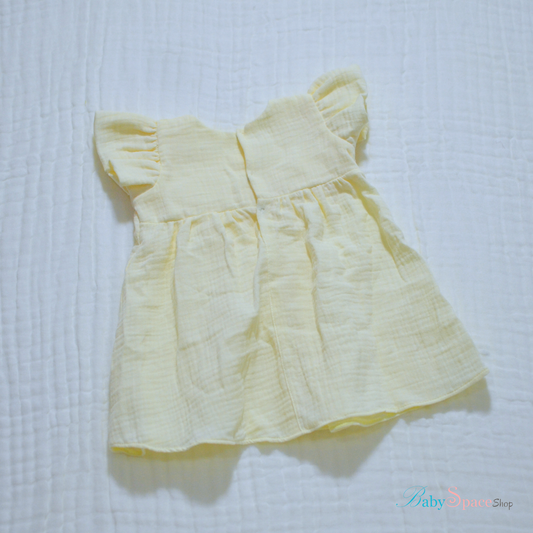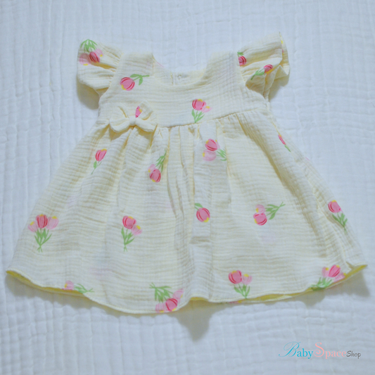 Handmade Muslin Printed Baby Dress - 3 to 6 months (Yellow)