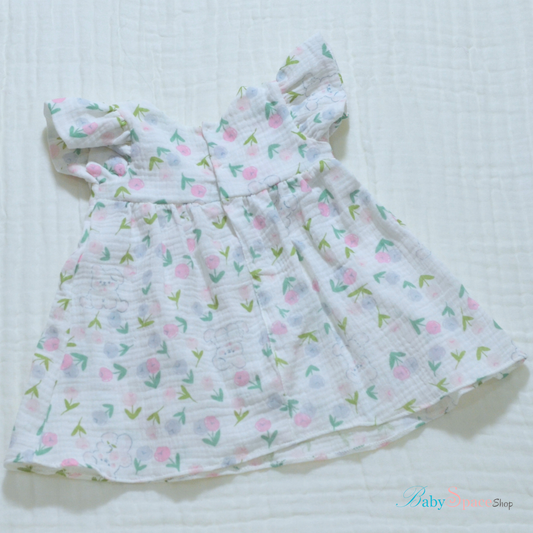 Handmade Muslin Printed Baby Dress - 3 to 6 months (Pink Bunny)