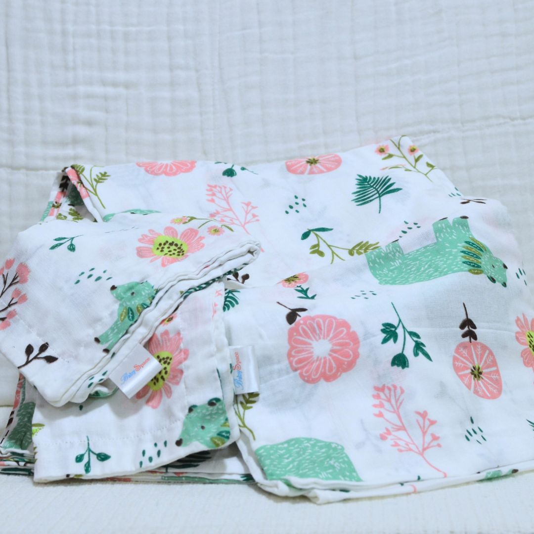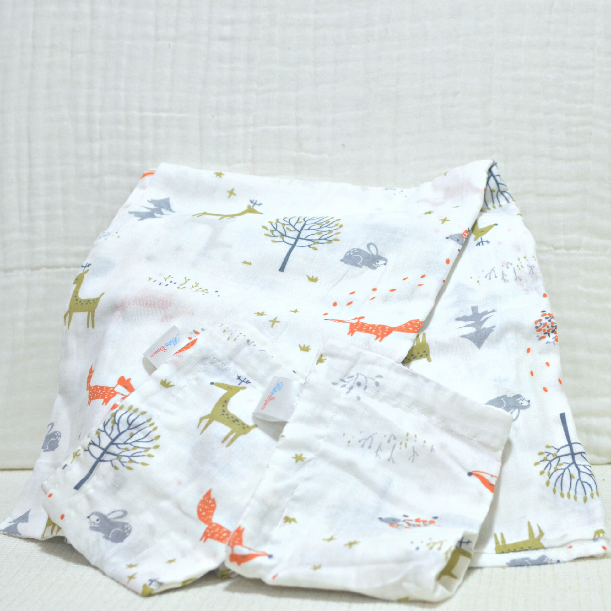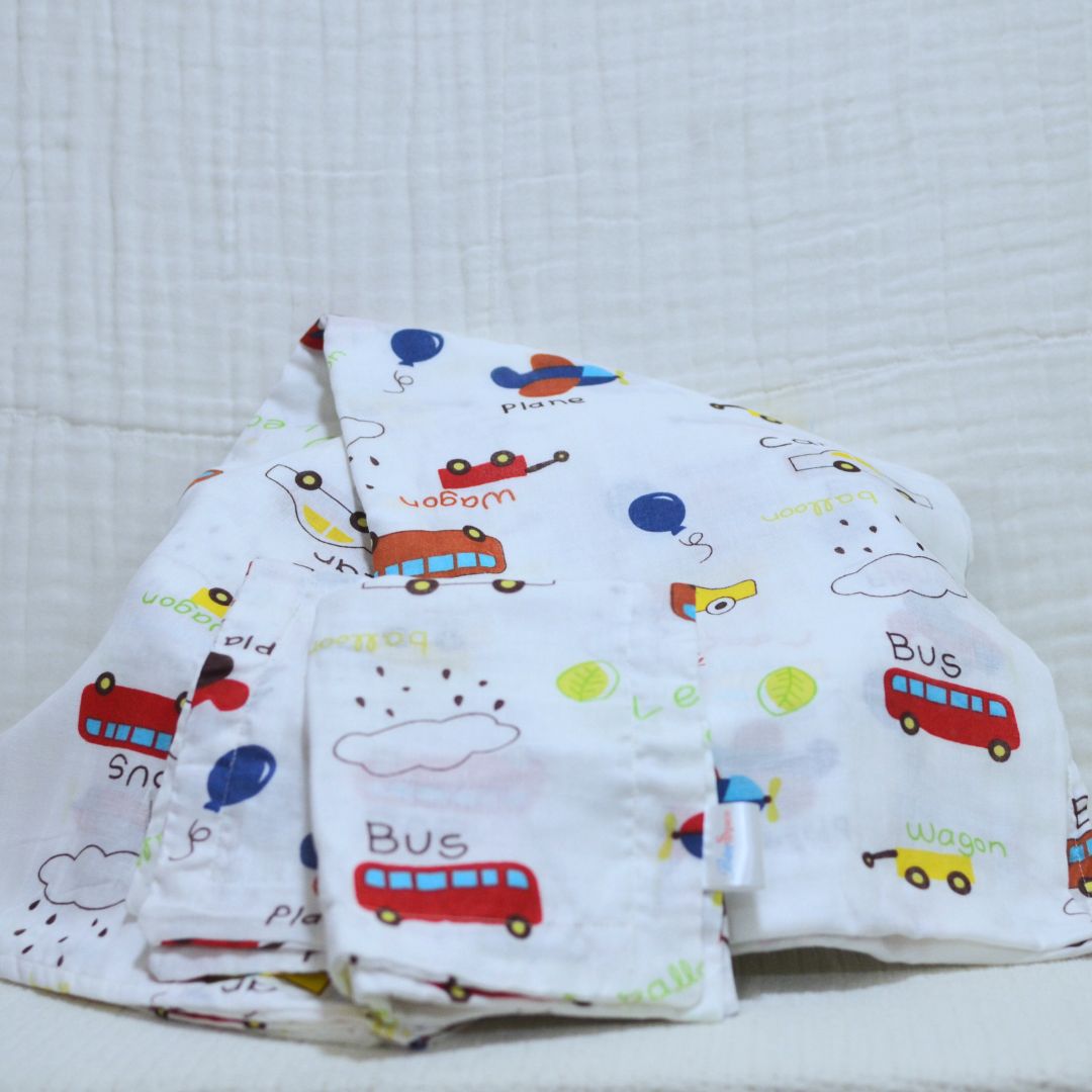 Breathable 100% cotton muslin printed baby crib / cot sheet with two matching pillow cases.