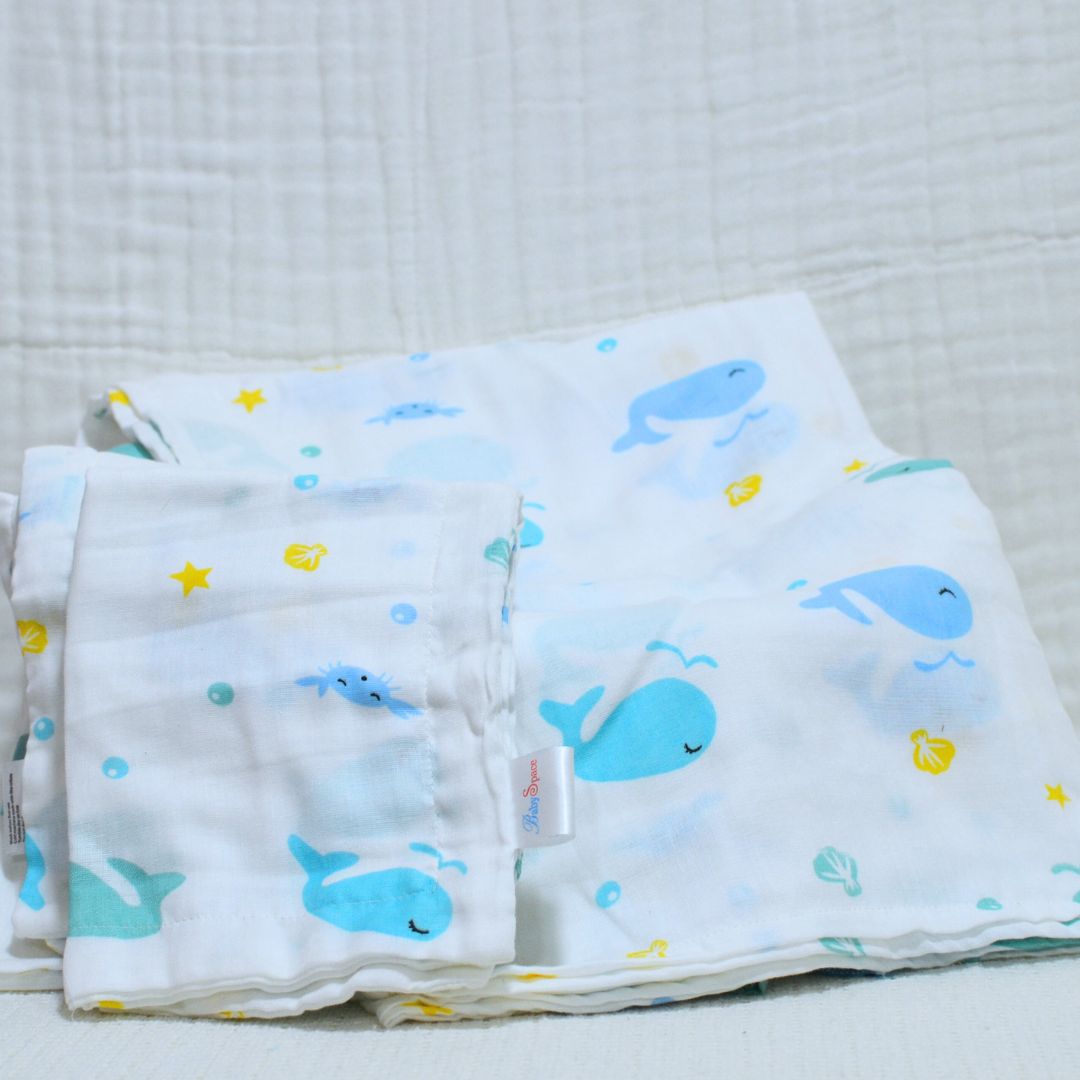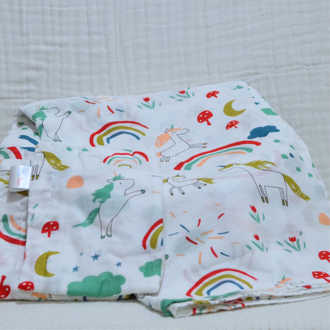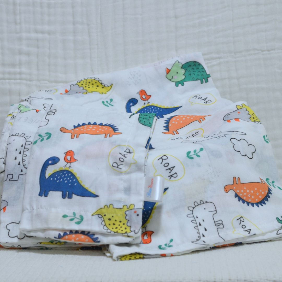 Breathable 100% cotton muslin printed baby crib / cot sheet with two matching pillow cases.