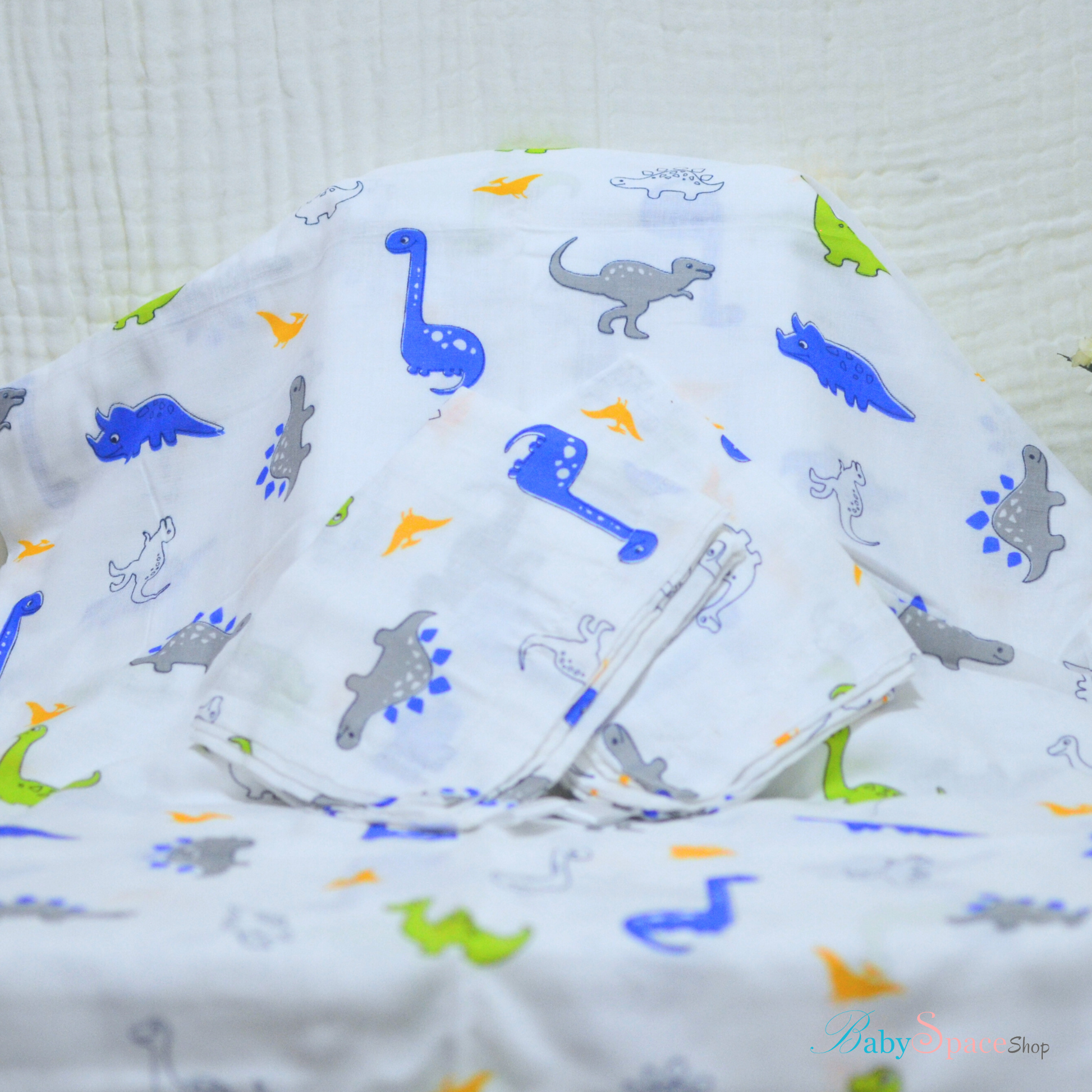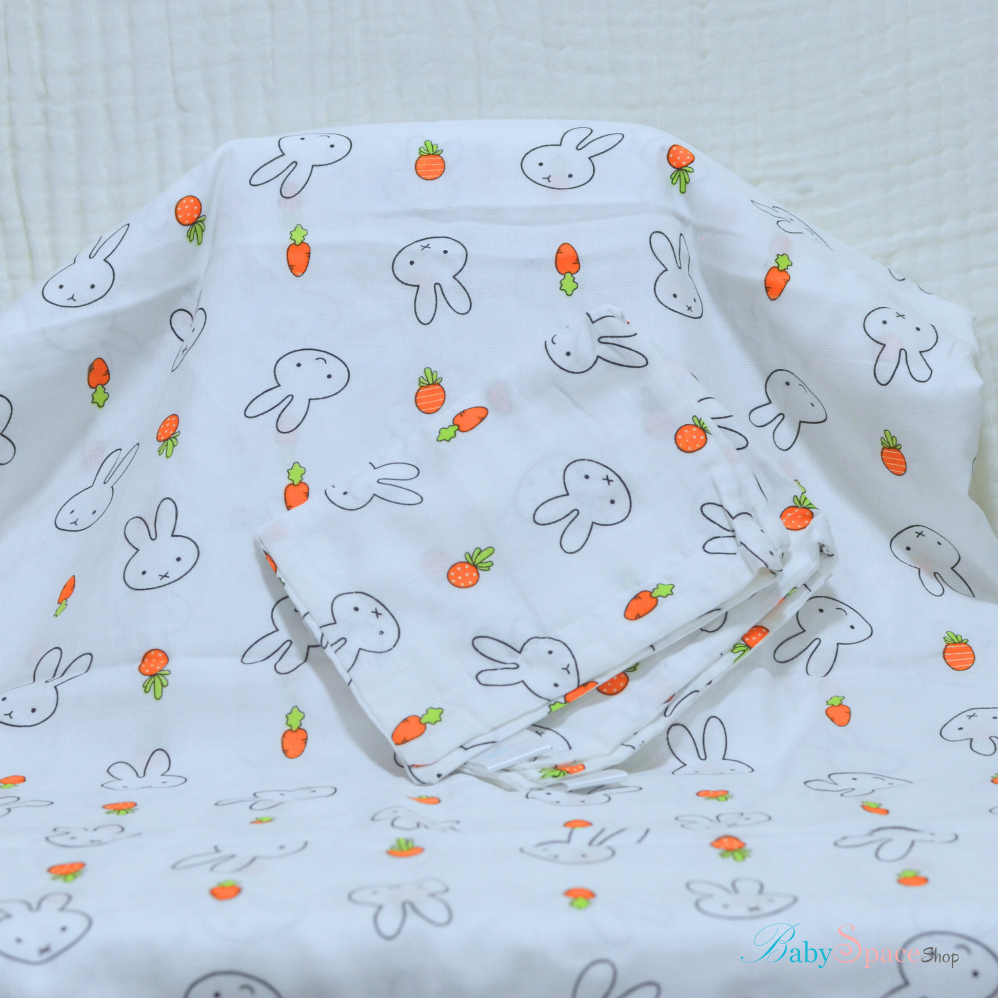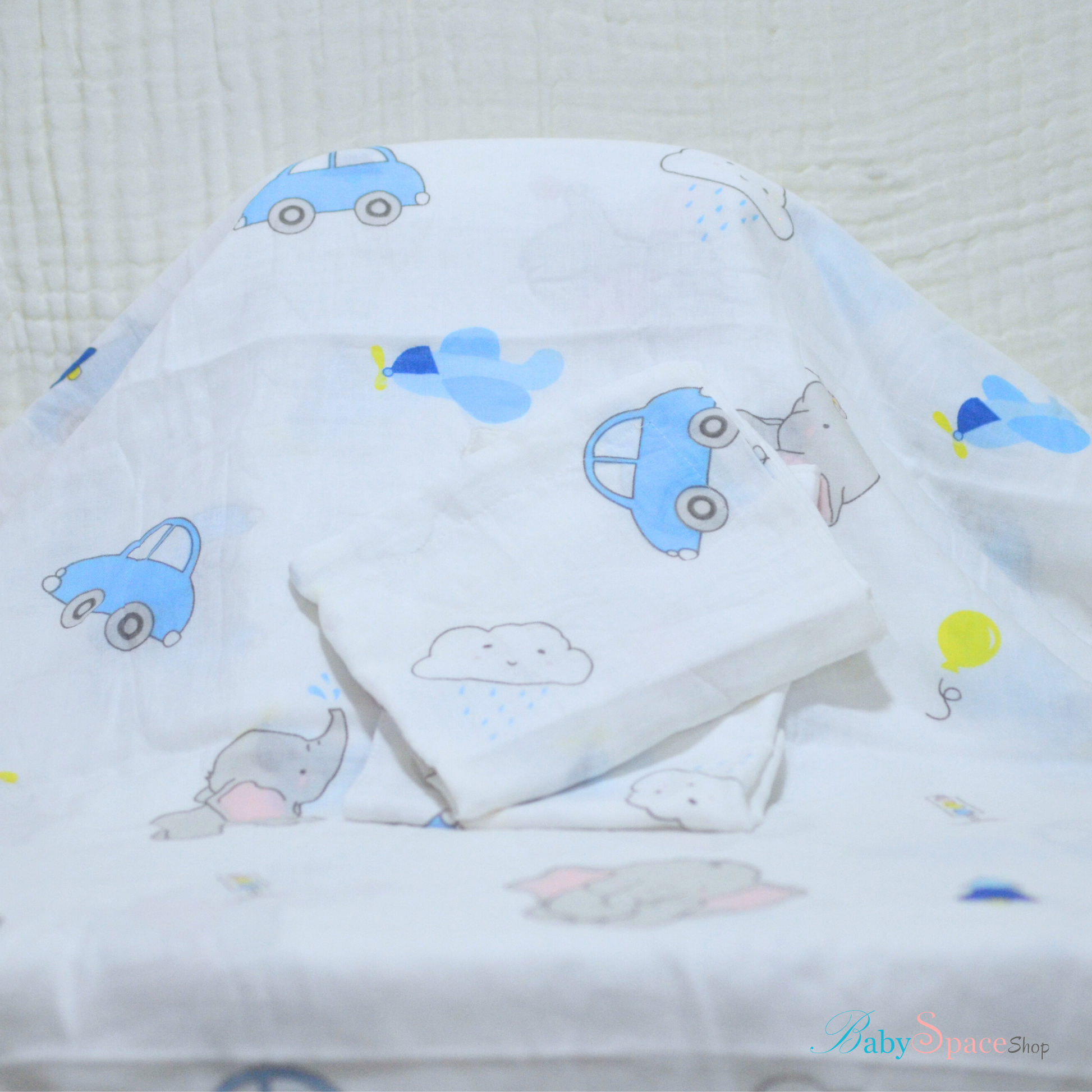 This baby cot sheet set features a breathable 100% cotton muslin fabric with a printed design, including one crib sheet and two coordinating pillowcases.