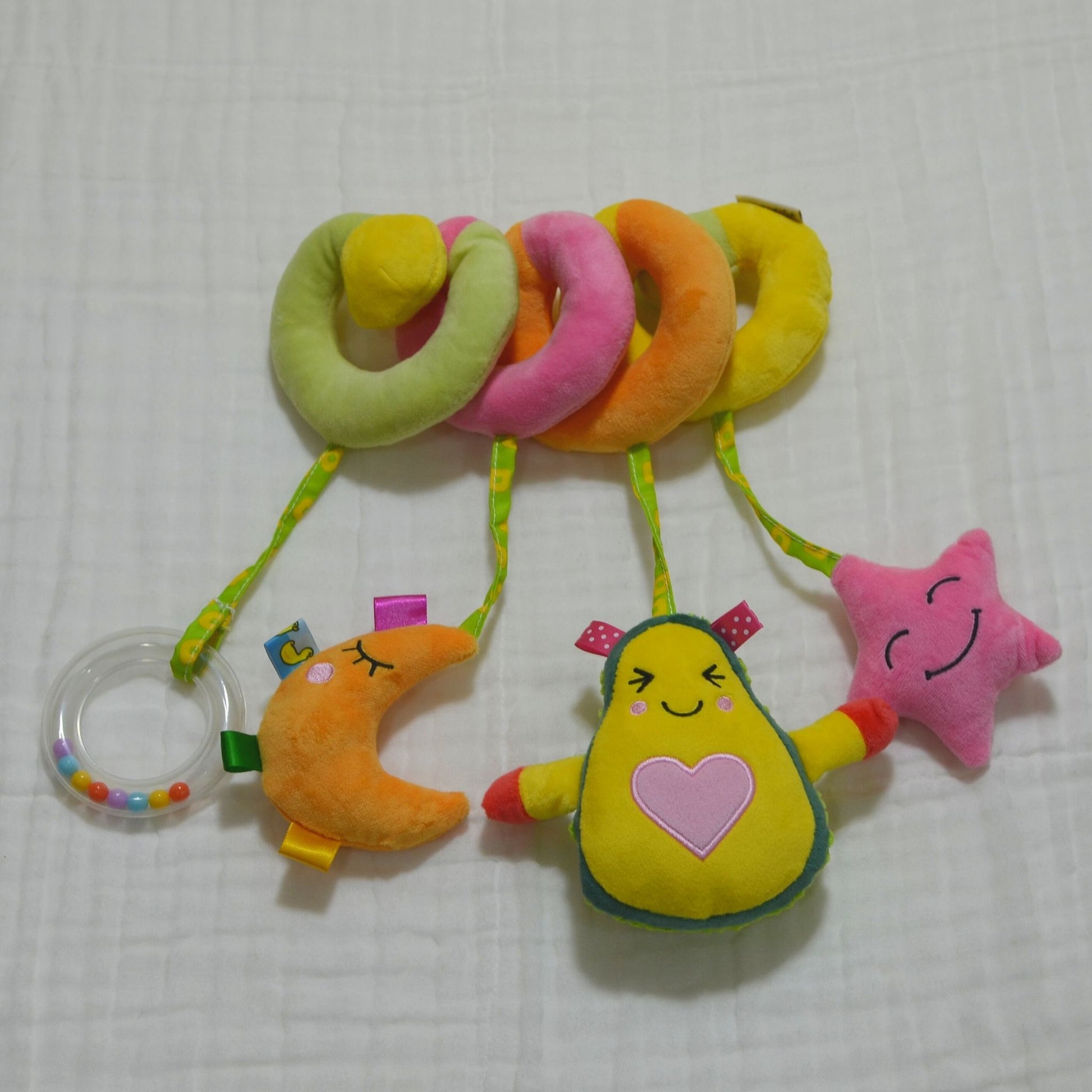 A toy made to be hung on the bed crib or the pram. Expands to attach to car seats, carrier bars, strollers and cribs for versatile play.