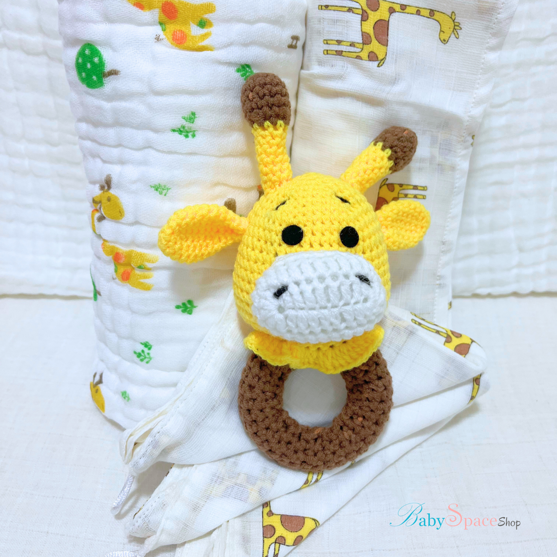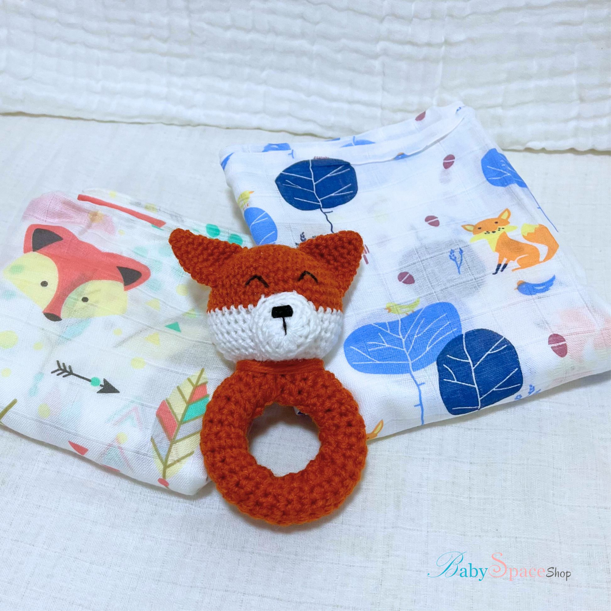 This bundle includes two soft cotton blankets, perfect for swaddling and keeping baby warm. It also comes with a matching rattle, making it a great gift for new parents. With a value price, it's a practical and thoughtful option for any baby registry.