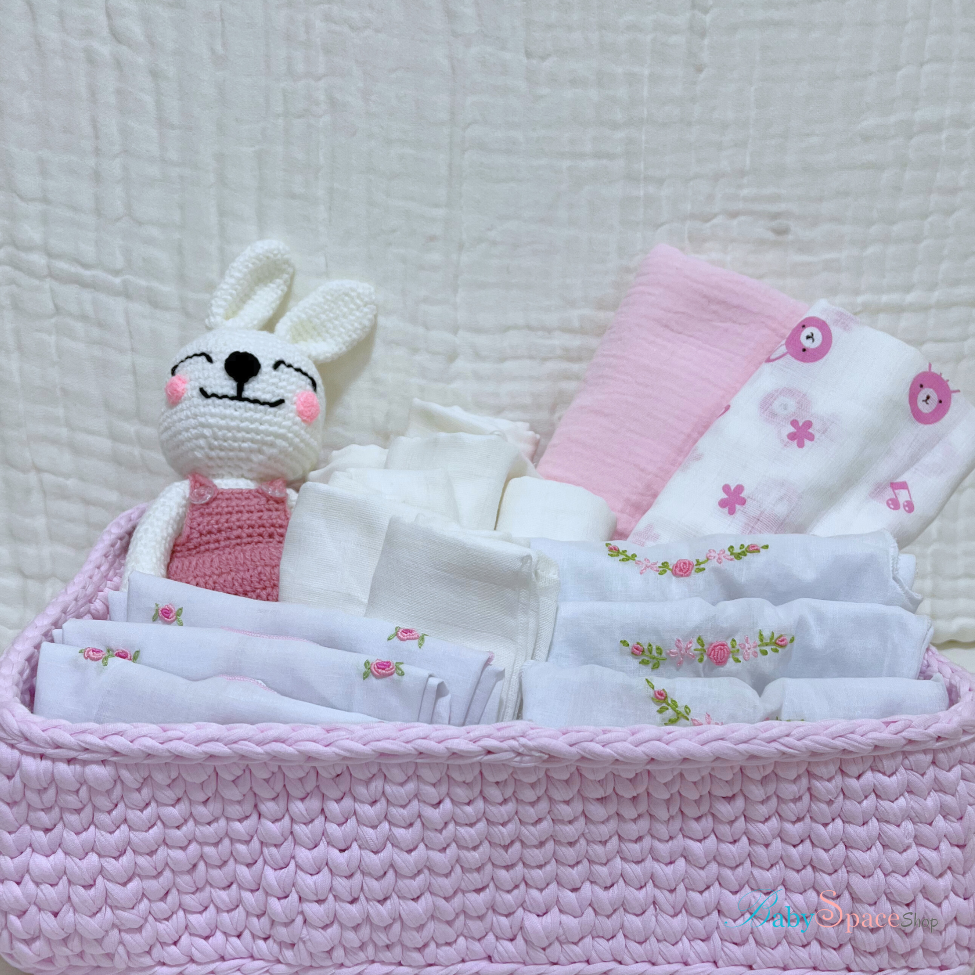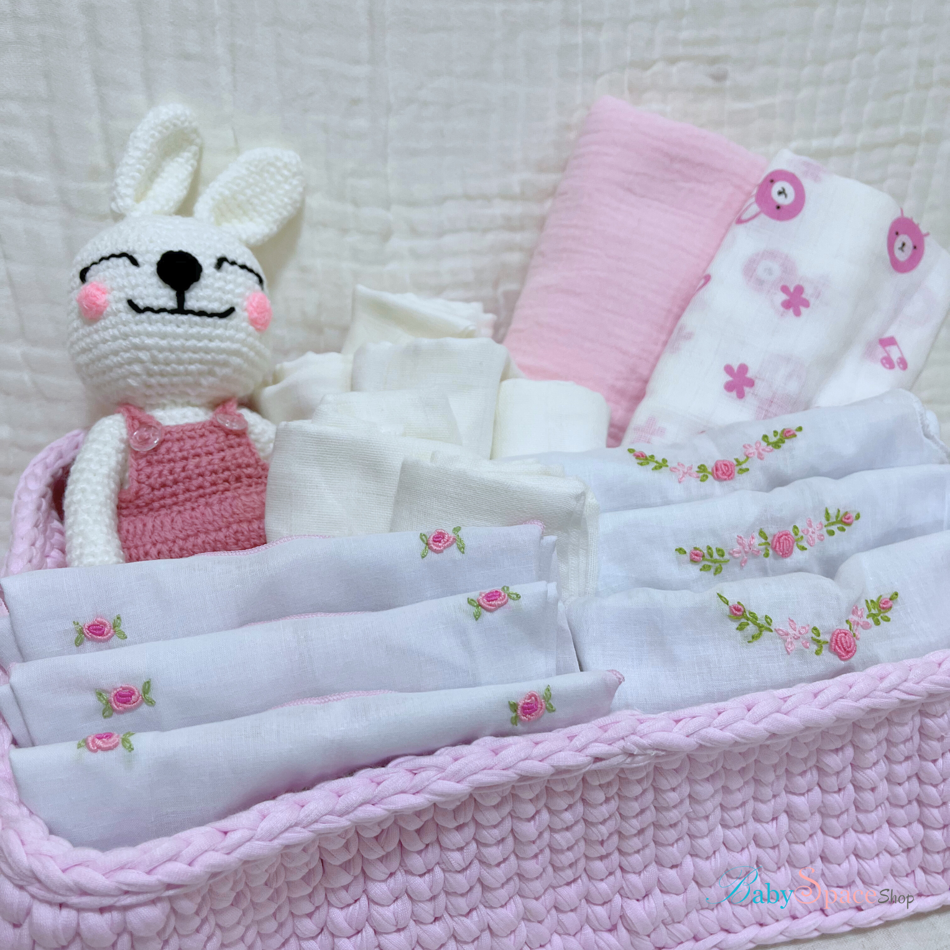 Designed for a newborn, this gift set includes a handcrafted crochet basket that offers an efficient and charming way to store and organize baby essentials.