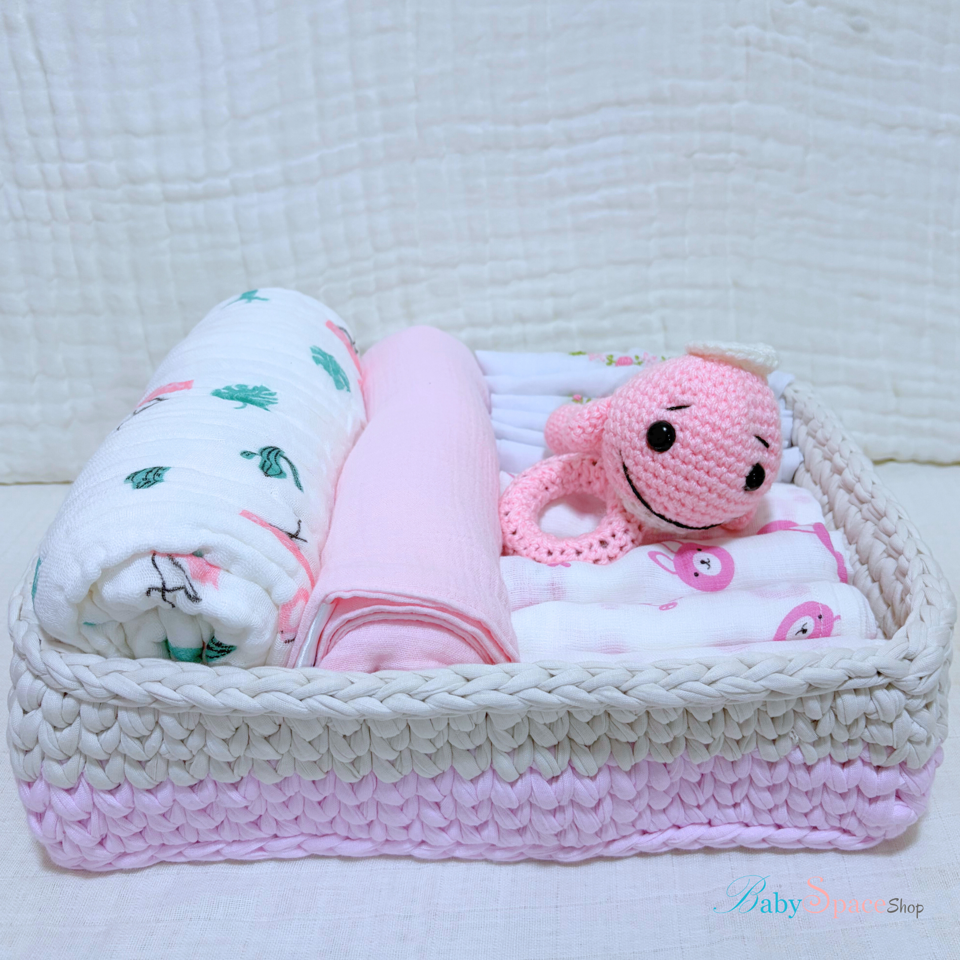 Designed for a newborn, this gift set includes a handcrafted crochet basket that offers an efficient and charming way to store and organize baby essentials.