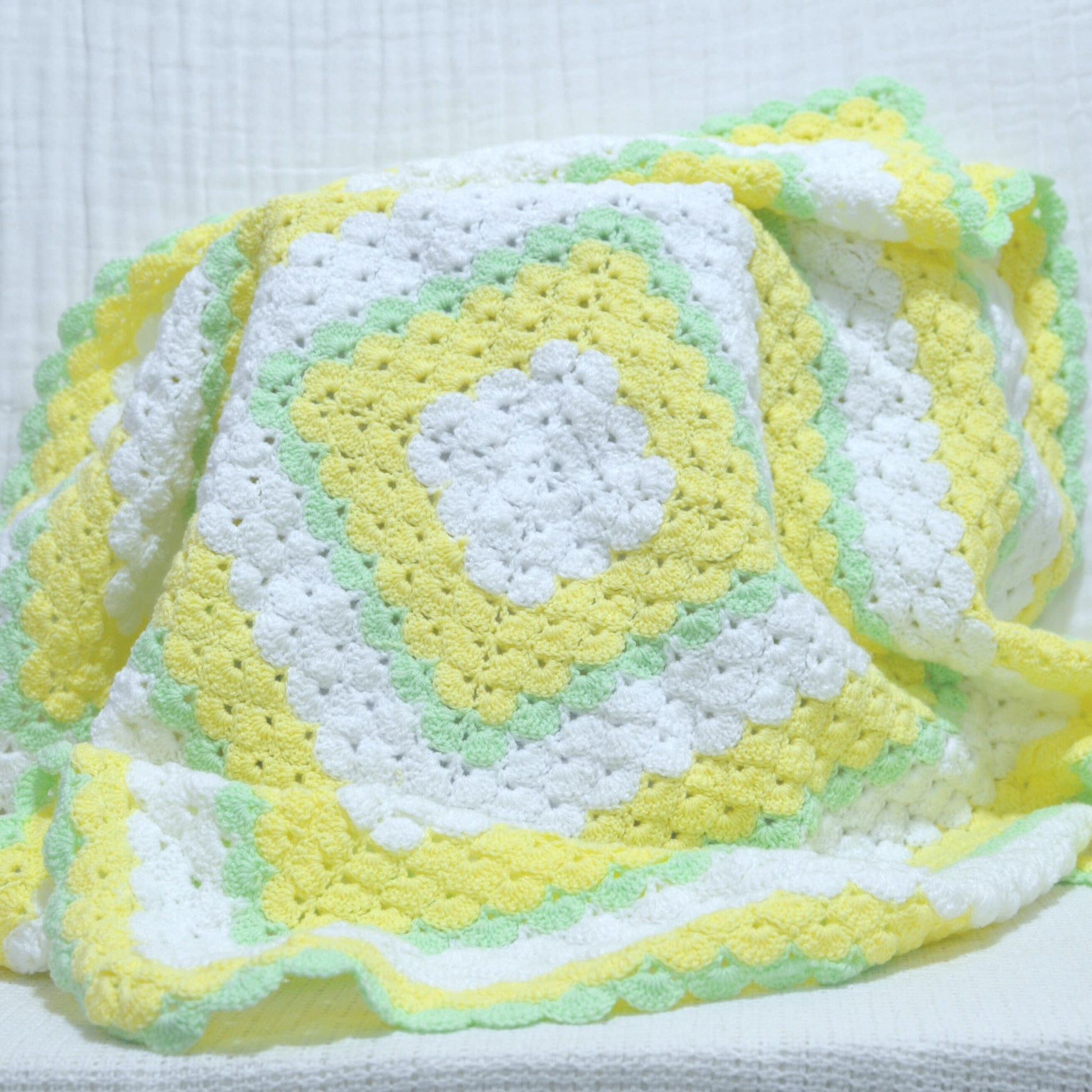 This handmade crochet baby blanket is perfect for keeping your little one warm and cosy. It is crafted from 100% cotton wool, making it soft and comfy to the touch. The blanket measures 75 x 75cm and features a delicate pattern of interlocking green, yellow and white crochet stitches.
