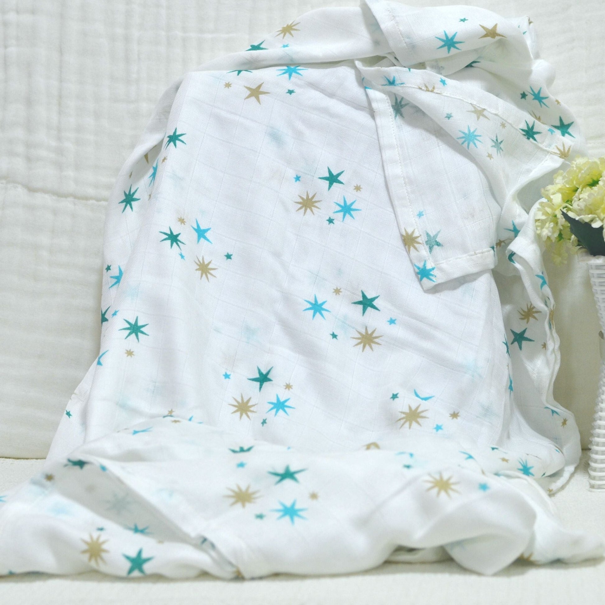 Breathable 70% Bamboo 30% Cotton blanket baby muslin swaddle, suitable as a burp cloth, nursing cover, stroller cover, swaddle or as receiving blanket.